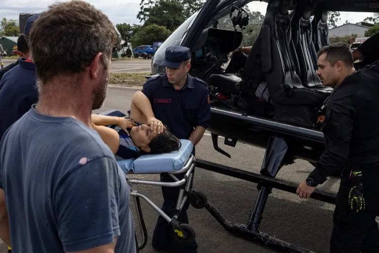En el vuelo de vuelta, evacuó a una mujer que llegó en camilla a un punto de atención a los afectados montado por los cuerpos de rescate en la carretera BR-116, en el municipio de Eldorado do Sul, uno de los más afectados por las inundaciones, según presenciaron periodistas de EFE.