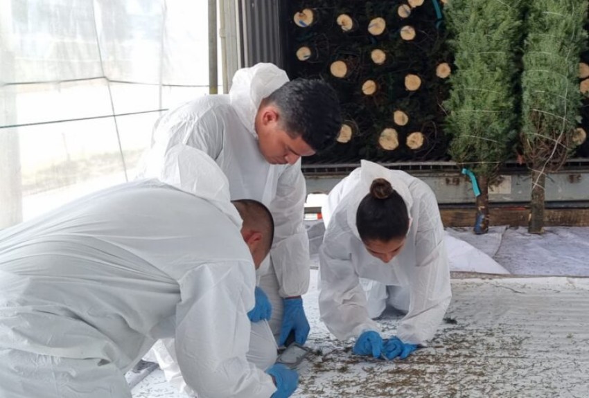 Agregó que el proceso consiste en sacar los árboles del contenedor utilizando una infraestructura con mayas y posteriormente se le aplica una remoción al árbol para inspeccionar cualquier insecto vivo que pueda caer dentro de una alfombra blanca que se coloca para identificar insectos.