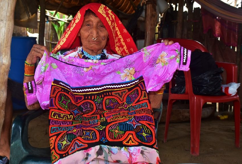 Entre los bohíos de paja y caña brava en la Comarca Guna Yala, lejos de los rascacielos y el tráfico de la ciudad de Panamá, Sipu Mayan, de 88 años de edad, beneficiaria del programa 120 a los 65 del Ministerio de Desarrollo Social (MIDES) teje con una visión milimétrica diseños geométricos vibrantes en camisas, bufandas, trajes y otras prendas conocidas como mola.