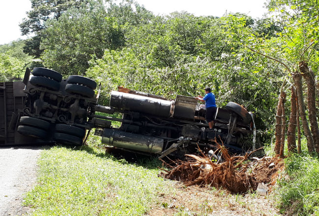 Tres personas resultaron heridas, entre ellos el conductor de un camión articulado que transportaba alimentos para animales y otros artículos, al volcarse en la carretera nacional que conduce hacia el distrito de Mariato.