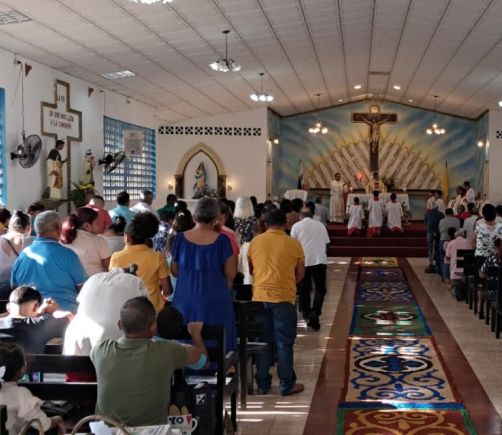 Feligreses de Lídice exponen coloridas alfombras para conmemorar el Corpus Christi