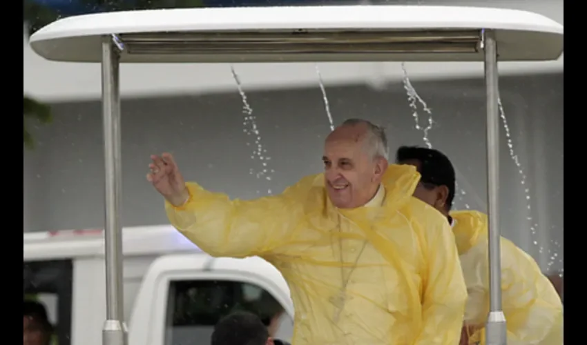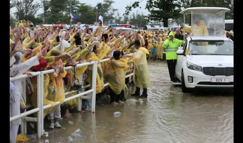 A pesar de la intensa lluvia, según el Vaticano, cerca 300,000 personas se dieron cita en la explanada del aeropuerto de Tacloban, protegidos solo por un chubasquero amarillo que proporcionó la organización y que fue el mismo que llevó el pontífice argentino durante toda su estancia en la pequeña isla del Pacífico.