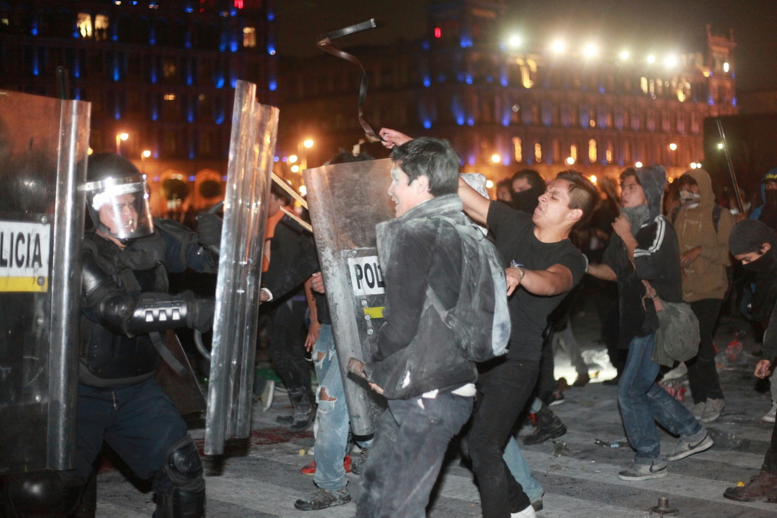 Quince detenidos, tres de ellos mujeres y otro un extranjero, fue el saldo de un choque aislado en el Zócalo de Ciudad de México, la plaza principal del país, tras finalizar un mitin pacífico de protesta por los 43 estudiantes desaparecidos en Iguala hace dos meses que congregó a decenas de miles de personas.