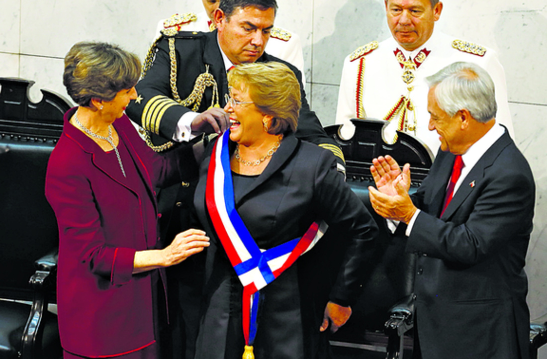 La nueva mandataria chilena, de 62 años, recibió la banda presidencial de manos de la nueva presidenta del Senado, Isabel Allende, hija del fallecido presidente Salvador Allende y la primera mujer en la historia de Chile en presidir la Cámara alta.