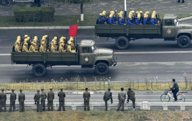 Duras amenazas a EEUU, una espectacular exhibición de armamento y alabanzas al líder, Kim Jong-un, sirvieron hoy al régimen comunista norcoreano para celebrar por todo lo alto el 70 aniversario del Partido de los Trabajadores. En la emblemática plaza de Kim Il-sung de Pyongyang, el contundente sonido de los rítmicos pasos de miles de soldados marcó el inicio del gran espectáculo que se esperaba para la conmemoración más importante de este año en Corea del Norte. La retórica fue dura. El joven líder, que presidió el desfile de tres horas desde el balcón principal del Palacio de la Cultura del Pueblo, se dirigió a su país y aseguró que Corea del Norte "está preparada para luchar en cualquier tipo de guerra provocada por EEUU". "Estados Unidos ha forzado guerras terribles y plantea la amenaza de nuevas agresiones. Además, ha ejercido contra nosotros sanciones y bloqueos sin precedentes para que no podamos desarrollar nuestra economía", aseguró Kim Jong-un frente a su Ejército, un pequeño grupo de dignatarios internacionales y una nutrida presencia de medios internacionales. Sin embargo, en esta inusual intervención del líder no hubo referencias a la vecina Corea del Sur ni al armamento nuclear, al que tanto recurre el régimen norcoreano como una de las señas de identidad de su política defensiva. Kim Jong-un se mostró seguro y contundente en su segundo discurso de este tipo desde que llegó al poder en diciembre de 2011. La anterior ocasión en que habló en público fue en abril de 2012 con motivo del centenario del nacimiento de su abuelo, el "presidente eterno" Kim Il-sung. Ante el joven líder miles de soldados -parte de ellos con uniformes de época en todo un repaso a la historia bélica y militar del país- protagonizaron un colorido desfile de dos horas y media en el que gritaron sin cesar "Defenderemos hasta la muerte a Kim Jong-un". El dictador, que recorrió el palco de un lado a otro para saludar efusivamente a los asistentes, estuvo acompañado por altas autoridades políticas, entre las que destacó la presencia de su hermana Kim Yo-jong, de 29 años, considerada una figura emergente en la nueva era de la dinastía estalinista. Además de carros de combate y vehículos acorazados, el Ejército Popular norcoreano también mostró proyectiles de diversos tamaño -entre ellos un gran misil que según expertos podría ser el KN-08 capaz de alcanzar territorio continental de EEUU- así como sus lanzaderas móviles y varios drones. A pesar del vistoso despliegue militar, no se observaron algunas de sus armas más contundentes, hecho que algunos han atribuido a la presencia del jefe de propaganda chino y número cinco de la jerarquía de poder de Pekín, Liu Yunshan. Kim mantuvo previamente una reunión con el representante de China, que sirvió para estrechar los lazos bilaterales de dos históricos aliados tras una época de alejamiento. Aparte de Lui la presencia de mandatarios extranjeros fue bastante reducida, sin que haya viajado a Pyongyang ningún jefe de Estado o de Gobierno, lo que muestra el nivel de aislamiento del régimen norcoreano. Al desfile militar le siguió otro aún más colorido de civiles que, acompañados por diversas y pintorescas carrozas, rindieron homenaje al líder supremo entre gritos de histeria y en el que destacaron dos enormes estatuas rodantes de Kim Il-sung y Kim Jong-il, el abuelo y el padre de Kim Jong-un. "Estoy muy feliz por haber formado parte de este evento y haber visto de primera mano a nuestro gran líder Kim Jong-un. No puedo expresar lo que siento con palabras", explicó a Efe Hi-soon, un médico de 39 años, tras participar en el multitudinario desfile. Vestida con el Jeogori, traje tradicional coreano, Ri Hae-yeon, trabajadora de una fábrica, reveló que llevaba ensayando cuatro semanas para esta celebración y que ha sentido "de manera profunda la unidad de su pueblo ante el líder". El gran desfile, uno de los mayores de la historia del país, comenzó a las 14.30 (6.00 GMT), una hora muy poco habitual para estos eventos, que suelen celebrarse por la mañana. Aunque el régimen, en su habitual secretismo, no había adelantado el horario, todo parece indicar que se retrasó varias horas para que sobre Pyongyang brillara un sol espléndido, lo que ayudó a dar más brillo a su celebración más importante del año.