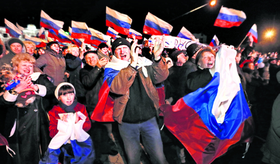 Aunque los resultados oficiales no se conocerán hasta hoy, en la plaza de Lenin de Simferópol, capital crimea, varios miles de personas de todas las edades celebran ya la victoria de la reunificación ondeando banderas tricolores rusas y crimeas.
