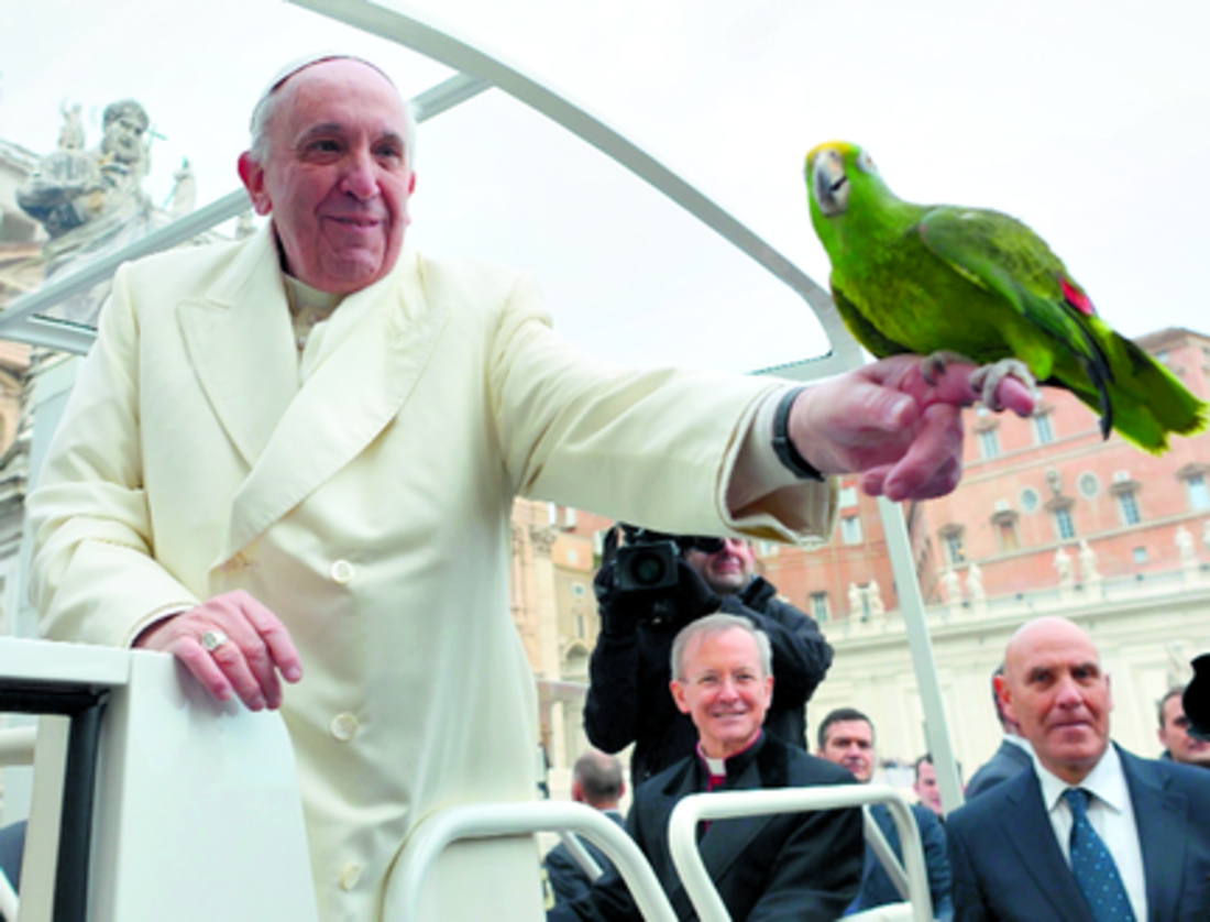 Después de que su suelta de palomas terminó mal el domingo, Francisco bendijo y sostuvo ayer un loro verde, llamado Amore, que le ofreció su dueño Francesco Lombardi.