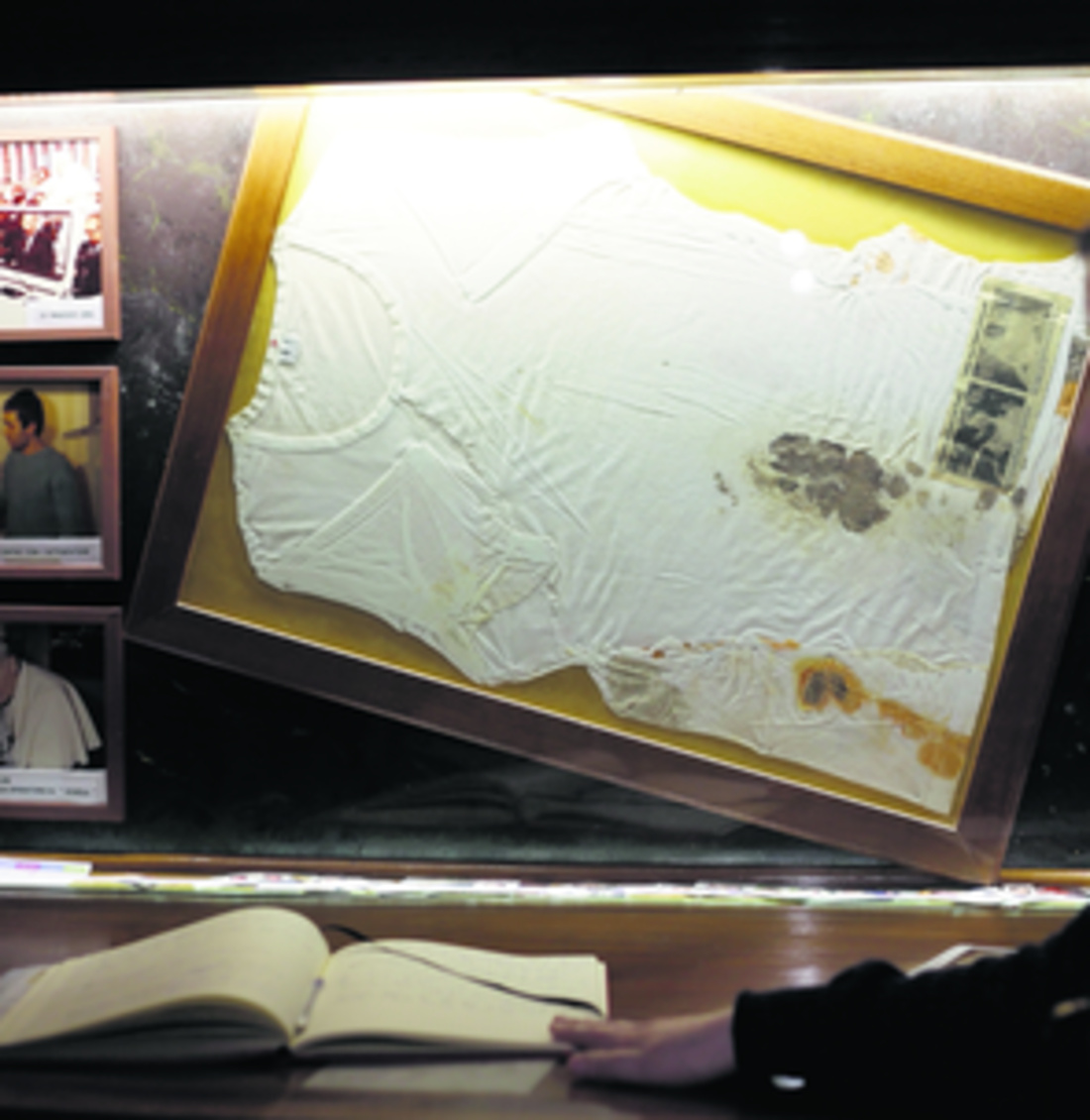 Detrás del cristal y sujeta con puntadas en un respaldo se encuentra una reliquia del santo sufrimiento: la camiseta manchada de sangre que Juan Pablo II llevaba puesta el día que un individuo le disparó en el estómago en la Plaza de San Pedro, el 13 de mayo de 1981.
