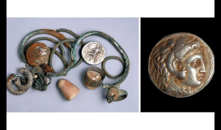 Un conjunto de monedas de plata con la efigie del mítico rey y varios objetos de bronce, entre ellos un brazalete, anillos y pendientes, han aparecido en una cueva de estalactitas y estalagmitas cuya ubicación es mantenida en secreto para evitar un posible saqueo, informó la Autoridad de Antigüedades.