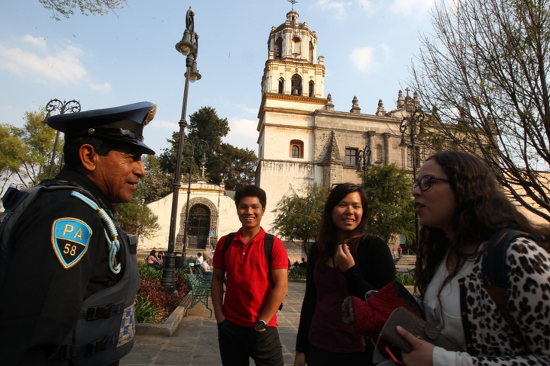 Orozco, uno de los 25,000 policías auxiliares de la Ciudad de México, trabaja en la delegación de Coyoacán, en la que, por sus atractivos turísticos, se relaciona con visitantes de los cinco continentes, asombrados por la cortesía de este hablador profesional.