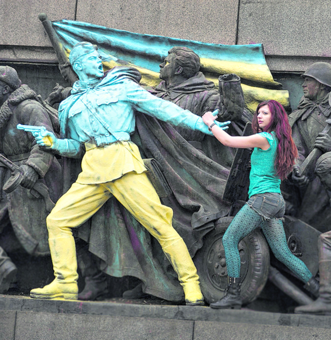 La frase Gloria a Ucrania y una alusión despectiva al presidente de Rusia, Vladimir Putin, aparecieron escritas en el conjunto monumental, en el que la escultura de un soldado soviético amaneció con los colores ucranianos y agitando una bandera con los colores de ese país. El monumento, construido el 1954 y que despierta aún una gran polémica, ha sufrido en varias ocasiones pintadas de protesta en los últimos años, sin que se haya descubierto nunca a sus autores.