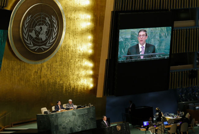 La Asamblea General de la ONU reclamó hoy nuevamente el fin del embargo estadounidense contra Cuba con la aprobación de una resolución respaldada por 191 países, pero a la que volvió a oponerse Estados Unidos. La Asamblea General lleva adoptando a petición del Gobierno cubano textos similares cada año desde 1992, pero esta era la primera vez que se pronunciaba desde que Cuba y EE.UU. iniciaron en diciembre de 2014 el restablecimiento de sus relaciones. Aunque durante los últimos meses EE.UU. alimentó las expectativas sobre una posible abstención en la votación de hoy, finalmente la delegación norteamericana votó en contra al considerar que la resolución "no representa" los pasos para el acercamiento dados en los últimos meses. "Lamentamos que el Gobierno de Cuba haya elegido seguir adelante con su resolución anual. El texto no representa los pasos significativos dados y el espíritu de compromiso que el presidente (de EE.UU., Barack) Obama ha defendido", dijo justificando la postura el diplomático estadounidense Ronald Godard. "Si Cuba cree que este ejercicio va a ayudar a que las cosas avancen en la dirección que los dos Gobiernos han indicado que esperan, está equivocada", insistió el representante de EE.UU., que junto a Israel fue el único país que votó en contra de la resolución, que apoyaron los otros 191 Estados miembros, sin ninguna abstención. El texto preparado por las autoridades cubanas acoge "con beneplácito el restablecimiento de las relaciones diplomáticas entre los Gobiernos de Cuba y los Estados Unidos de América" y reconoce "la voluntad" expresada por Obama "de trabajar por la eliminación del bloqueo económico, comercial y financiero". Sin embargo, expresa como en otras ocasiones preocupación por la continuidad de la política y por los "efectos negativos" que tiene sobre los cubanos y urge a tomar medidas "en el plazo más breve posible" para derogar o dejar sin efecto el embargo. El canciller cubano, Bruno Rodríguez, subrayó al presentar la resolución que pese a los avances en la relación bilateral, no ha habido "ninguna modificación tangible" en "la práctica del bloqueo". "No debemos confundir la realidad con los deseos ni las expresiones de buena voluntad. En asuntos como estos, solo puede juzgarse a partir de los hechos. Y los hechos demuestran, con toda claridad, que el bloqueo económico, comercial y financiero impuesto contra Cuba está en plena y completa aplicación", dijo Rodríguez. El jefe de la diplomacia cubana defendió que el embargo "es una violación flagrante, masiva y sistemática de los derechos humanos de todos los cubanos" e insistió en que es "el principal obstáculo para el desarrollo económico y social" de la isla. En las intervenciones previas a la votación, grupo como el Movimiento de Países No Alineados, el Mercosur o la CELAC, países latinoamericanos como Colombia y Venezuela y potencias como Rusia y China mostraron también claramente su oposición al embargo y pidieron su fin.