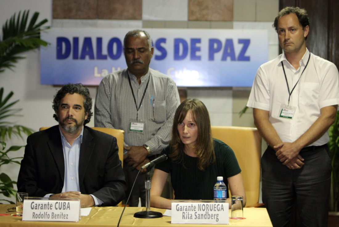 La crisis en el proceso de paz colombiano desatada por el secuestro desde el domingo del general Rubén Darío Alzate y dos personas que le acompañaban, en una zona selvática del noroeste de ese país, puede estar cerca de terminar. Los representantes de los Gobiernos de Cuba y Noruega, que actúan como garantes de las negociaciones que Colombia y la guerrilla de las Farc mantienen en La Habana, anunciaron la tarde de este miércoles que ambas partes han pactado las condiciones necesarias para la liberación del alto mando militar y de otras cuatro personas más en poder del grupo armado.