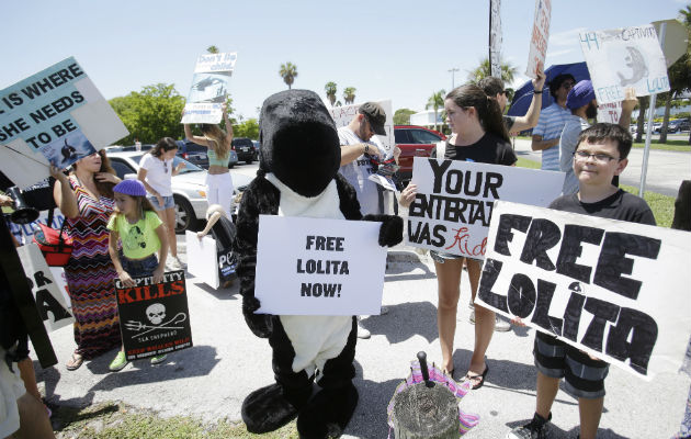 Más de 60 personas se concentraron en la entrada del Miami Seaquarium para protestar por el confinamiento de la orca Lolita en uno de sus estanques de agua marina, cuando se cumplen 45 años desde que fue capturada en las costas del estado de Washington (EE.UU.). Los manifestantes, integrantes de la organización Personas a favor del Trato Ético a los Animales (PETA) y del grupo local Red de Activismo Animal, solicitaron que la orca sea trasladada a un "santuario de la costa", donde pueda nadar libremente y reunirse con otros miembros de su manada que aún se mantienen con vida. Jared Goodman, directivo de la Fundación PETA, pidió previamente, "en nombre de la decencia y la bondad común", que terminen estas "décadas de cautiverio y aislamiento en las que ha vivido Lolita lejos de su especie". "Es una tortura a largo plazo", señaló al periódico Miami Herald Marian Prio, una activista que en medio de la calurosa jornada de hoy aceptó la tarea de meterse en un disfraz de orca y demandar la libertad de una de las principales atracciones de este parque acuático en Miami. A lo largo de la jornada, los activistas se dirigieron en más de una ocasión a los visitantes del recinto para intentar persuadirles de que dieran marcha atrás y no pagarán su billete de entrada. El parque temático mantiene un pulso con los activistas locales, en especial luego de que Lolita fuera incluida a comienzos de este año en una lista federal de animales protegidos en el marco de la Ley de Especies en Peligro (ESA) de Estados Unidos. En medio de esa lucha, el pasado 20 de julio una coalición de organizaciones ambientalistas presentó una demanda contra el Seaquarium de Miami al considerar que las condiciones de cautiverio de la popular orca "violan" dicha normativa. Días atrás, el alcalde de la ciudad estadounidense de Miami Beach, Philip Levine, respaldó la campaña de PETA al afirmar que "este animal protegido debe ser liberado tan pronto sea posible de las abominables condiciones en el Seaquarium y trasladado a un santuario en su casa en el océano". "Miami debería ser conocida como la hermosa, moderna ciudad que es, no como el hogar del tanque para orcas más pequeño de Norteamérica", agregó Levine, a cuyo reclamo se sumaron también otras personalidades locales como el empresario Jorge Pérez, fundador del Pérez Art Museum Miami (PAMM). Con 20 pies de largo, Lolita fue capturada en 1970 en la región de Puget Sound, en el estado de Washington junto a otras ballenas que luego fueron vendidas a empresas dedicadas a las atracciones marinas en Estados Unidos, entre ellas el Parque Acuático de Miami. A su llegada al parque de atracciones, Lolita, cuyo nombre original es Tokitae, se unió a Hugo, otra orca que residía en ese mismo estanque y que falleció tras embestir su cabeza repetidamente contra las paredes del embalse en 1980. Desde entonces, Lolita no ha estado en comunicación con otros ejemplares de su especie.