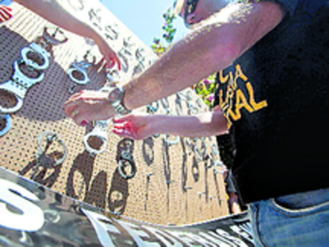 EtiquetasUn grupo de Policías Federales (PF) colgó de manera simbólica sus esposas en São Paulo en protesta por la falta de apoyo a su trabajo y para reclamar mejores condiciones de trabajo por parte del Gobierno brasileño.