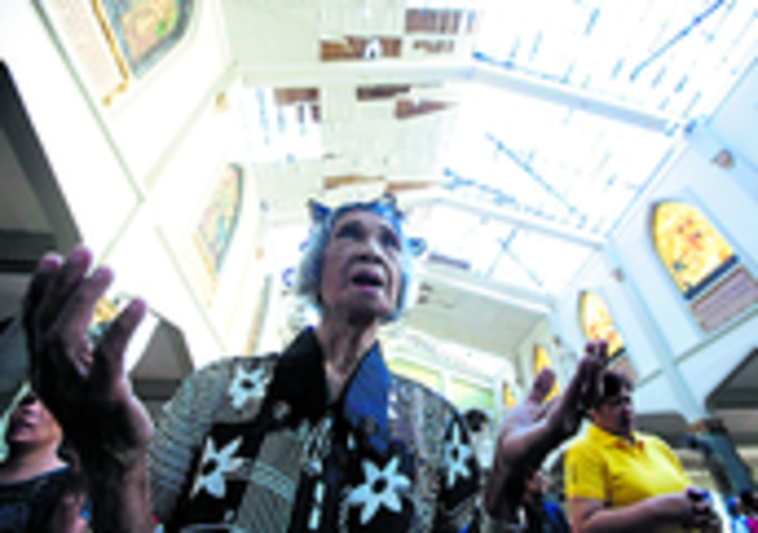 Filipinas / Filipinas 80% de los 90 millones de filipinos son católicos.30 familias desamparadas viven en la iglesia.44 años de edad tiene el sacerdote Alvero.Decenas de fieles participan en misas para agradecer por haber sobrevivido a la furia del tifón.Horas después que el tifón Haiyan se abatió contra las Filipinas, el sacerdote Amadero Alvero salió a las calles rociando agua bendita sobre los muertos y orando por ellos.Al caer la tarde, el sacerdote de 44 años ya había bendecido unos 50 cadáveres.Después regresó a la semidestruida iglesia Santo Niño de Tacloban y ofició una misa.Alvero volvió a celebrar otra misa ayer para cientos de sobrevivientes de uno de los peores tifones que haya azotado Filipinas.Pese a lo sucedido, todavía creemos en Dios, comentó el prelado.