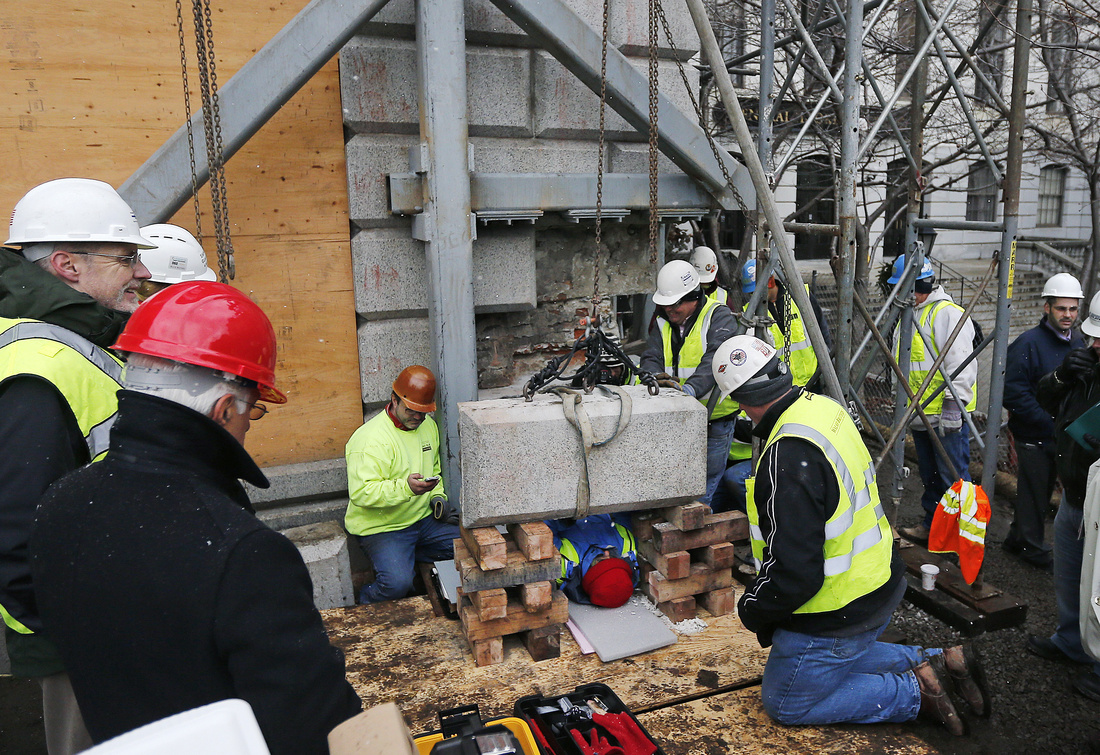 Una cuadrilla procedió a retirar una cápsula del tiempo que data de 1795 y que estuvo enterrada en la piedra angular del Capitolio de Massachusetts.