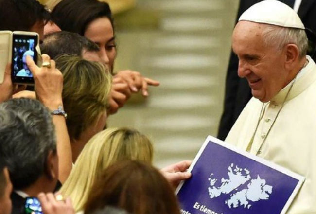 La fotografía del pontífice sonriendo cuando le entregaron el cartel con la leyenda "Es tiempo de diálogo entre Argentina y Reino Unido por Malvinas'' tuvo amplia repercusión en Argentina, su país natal.