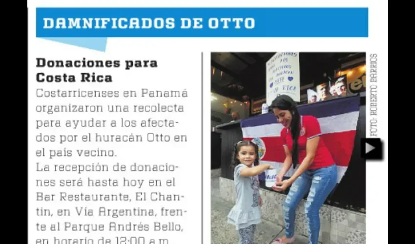 La recepción de donaciones será hasta hoy en el Bar Restaurante, El Chantin, en Vía Argentina, frente al Parque Andrés Bello, en horario de 12:00 a.m. hasta las 7:00 p.m, explicó Elyin Hernández, presidente de la Asociación de Profesionales Costarricense en Panamá.