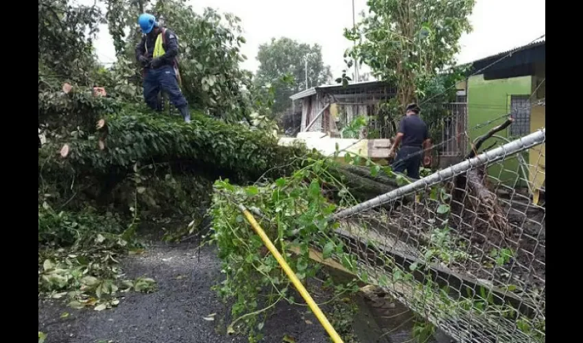 La mañana de este sábado, producto de la lluvia y fuertes vientos, un enorme árbol sucumbió a la embestida de la naturaleza y cayo, provoco la destrucción de la cerca perimetral de una vivienda situada en calle tercera del Cuadrante de Base Line en Changuinola, Bocas del Toro, así como el desprendimiento de cables tanto del sistema de distribución eléctrica como de servicios de telefonía.