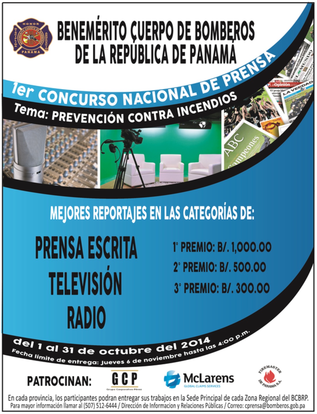 Aún están a tiempo de participar en el Primer Concurso Nacional de Prensa del Benemérito Cuerpo de Bomberos de la República de Panamá BCBRP- 2014, donde se otorgará reconocimiento a los mejores reportajes publicados en televisión, radio y prensa escrita, que hayan sido publicados a nivel nacional, que informen y promuevan a los protagonistas y a los hechos vinculados al tema de prevención contra incendios. Todo ello justo en el marco del Mes de la Prevención de Incendios en Panamá.