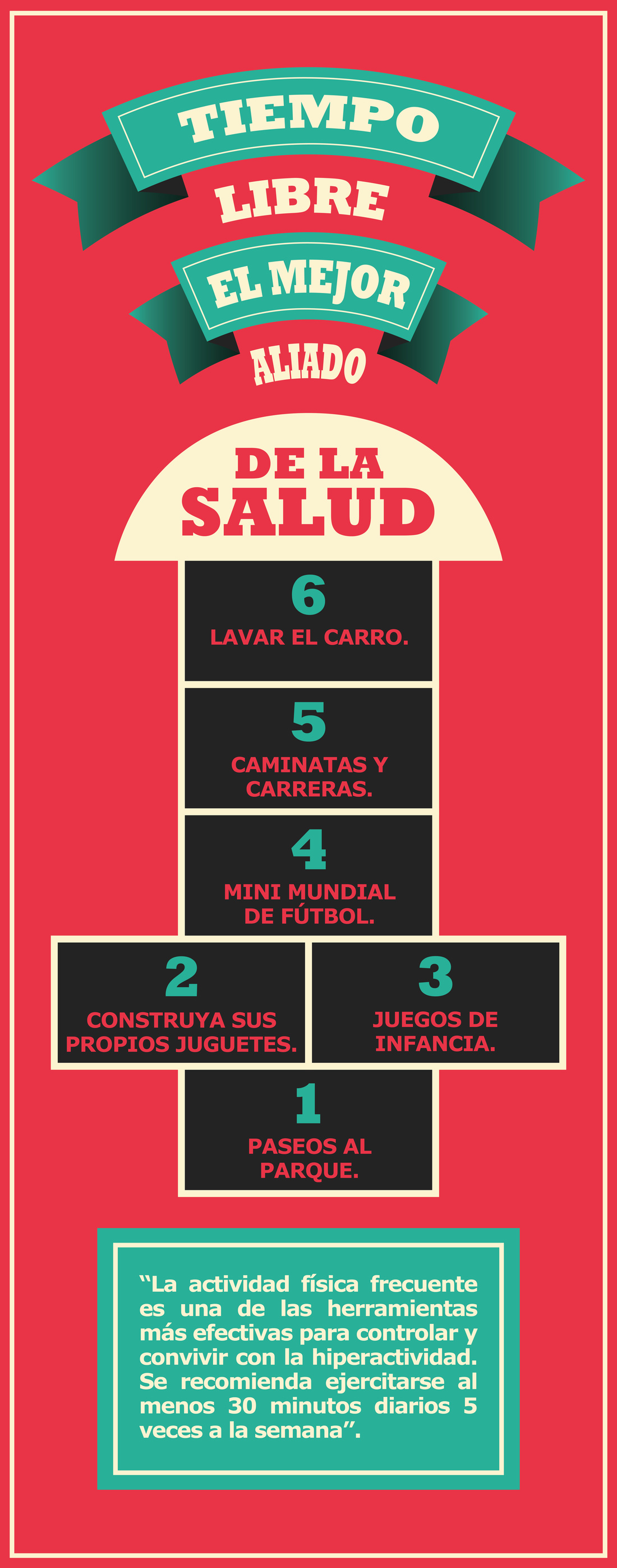 Está demostrado que realizar 1 hora de actividad física, 5 veces a la semana, ayuda a una mejor concentración, a desarrollar niños más alegres y sanos y a la vez agotar excesos de energía que luego propicien cuadros de insomnio, detalló Medina.