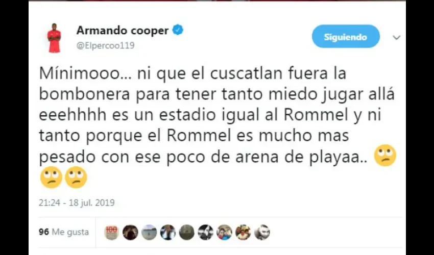 "Mínimooo... ni que el Cuscatlán fuera la Bombonera para tener tanto miedo jugar allá eeehhhh es un estadio igual al Rommel y ni tanto porque el Rommel es mucho mas pesado con ese poco de arena de playaa", fue el tuit lanzado por Cooper.