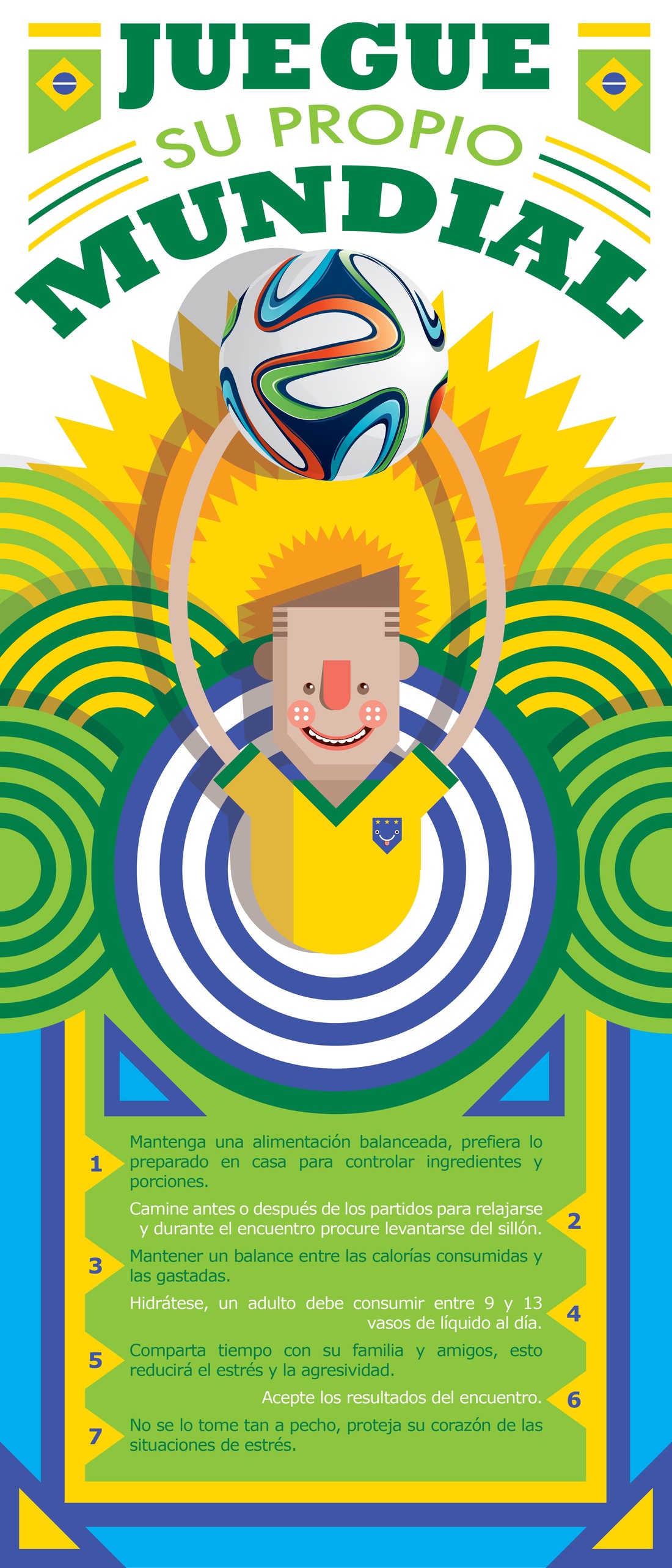 El médico especialista en Deportes y Nutrición Richard Marine brindó una serie de consejos para que disfrute el Mundial de forma saludable. Entre los consejos del especialista están: preferir los bocadillos preparados en casa, donde se tenga el control de los ingredientes y las porciones que se sirven; además, procure incluir todos los tipos de alimentos en sus platillos, ningún alimento es bueno o malo por sí solo. Se recomienda ver el partido en familia, esto ayuda a reducir los niveles de estrés provocados por la intensidad de los encuentros de fútbol.