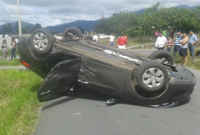 La colisión se dio entre dos vehículos tipo sedán, tras la cual uno terminó volcando.