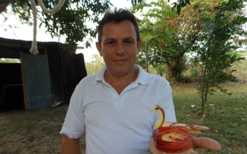 En junio del año pasado viajábamos en el auto y decidimos pasar a comprar unas manzanas a un súper, estando allí recordé que se podían hacer diseños en frutas y opté por comprar algunas para trabajarlas, aprovechando que tengo el don de dibujar, expresó Espinoza.
