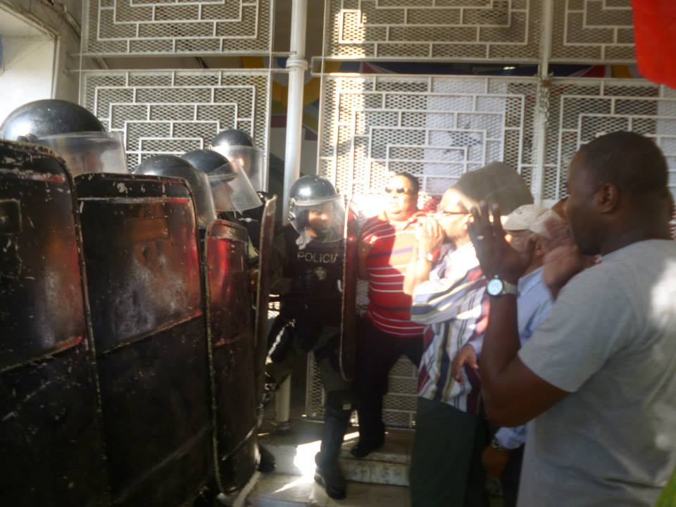 Redacción webPersonas que han sido despedidas en el Municipio de Colón, han impedido que los demás funcionarios entren a laborar.Los protestantes gritan consignas contra el alcalde Damaso García y aducen que no se retirarán del lugar hasta que vuelvan a contratar a todos.Alex Lee, representante de Barrio Sur aseguró que el alcalde García está molesto porque no ganó en las primarias de su partido, ahora los trabajadores sufren las consecuencias.Al lugar llegaron Unidades del Control de Multitudes (UCM) para quitar a las personas de la entrada principal del Municipio de Colón.
